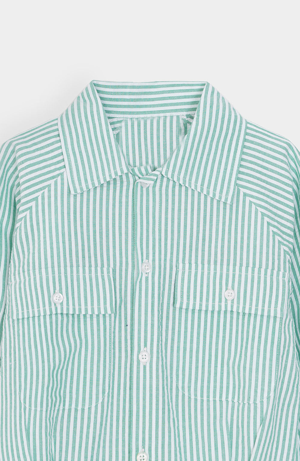 A trendy striped shacket in a fresh green and white combination, crafted from striped cotton fabric for a comfortable feel and breathable wear.