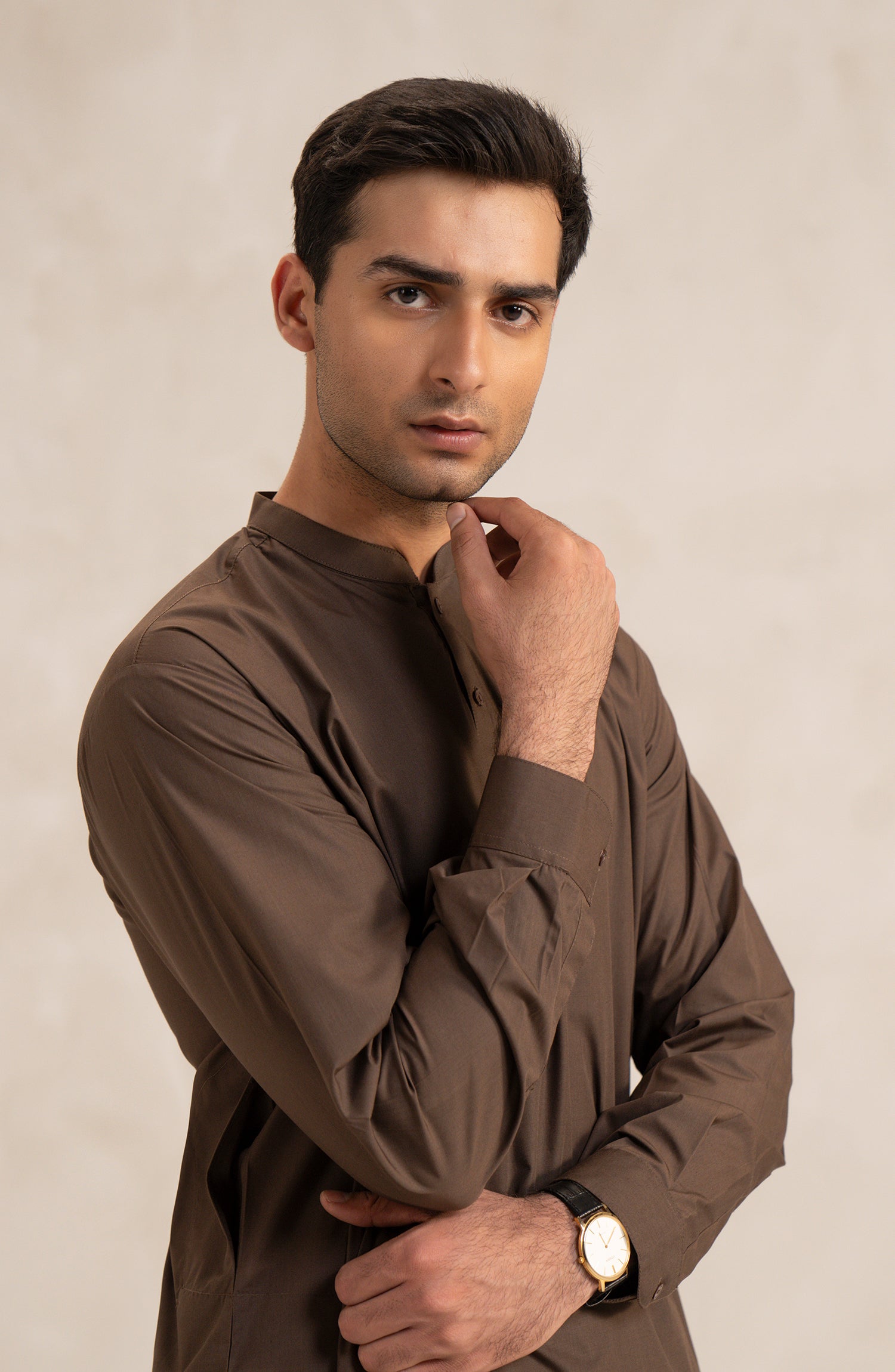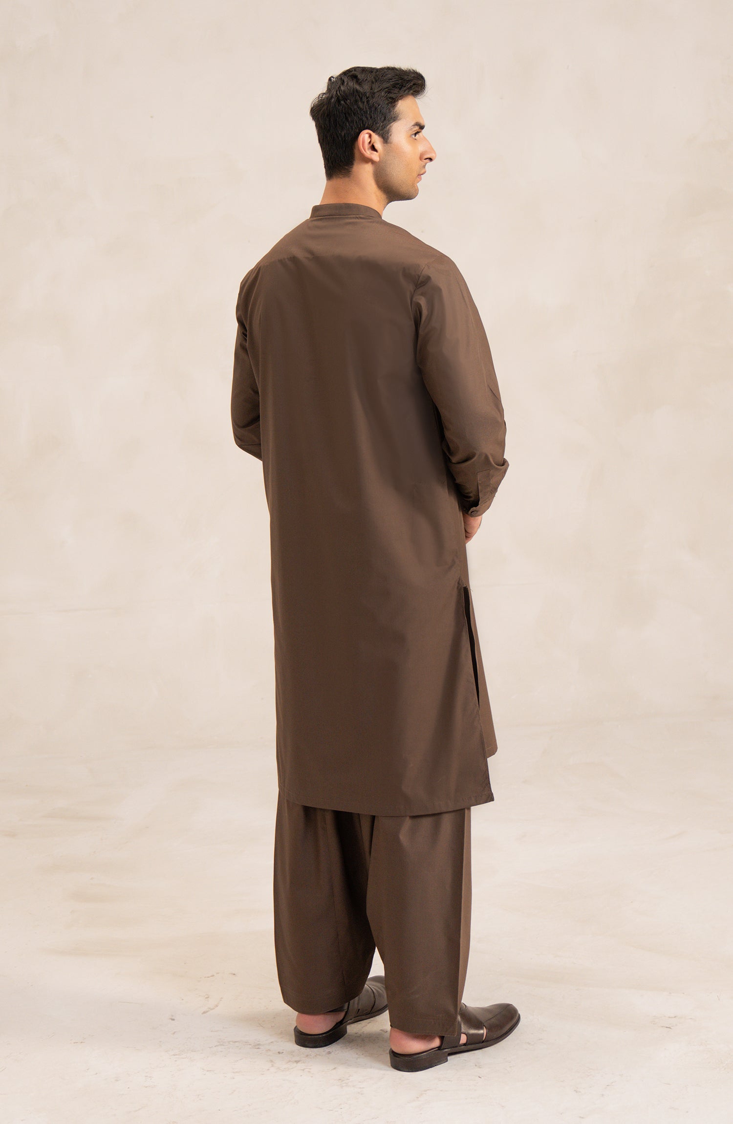 A rich chocolate-colored kurta shalwar suit designed for comfortable yet stylish traditional wear.