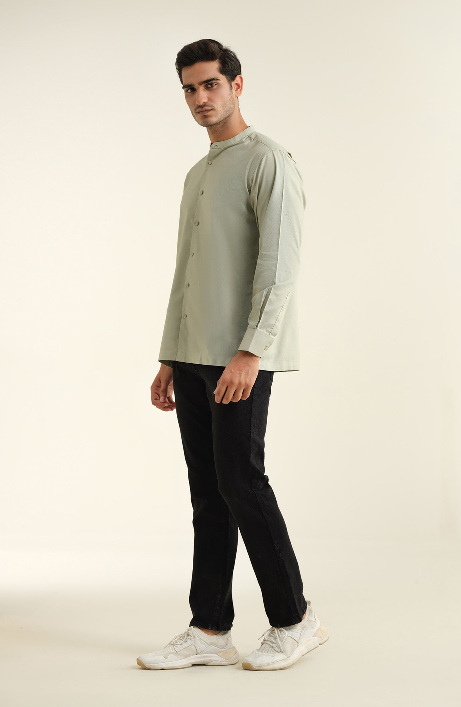 A fresh take on smart casual, this light green shirt with a band collar offers timeless charm with a modern twist.