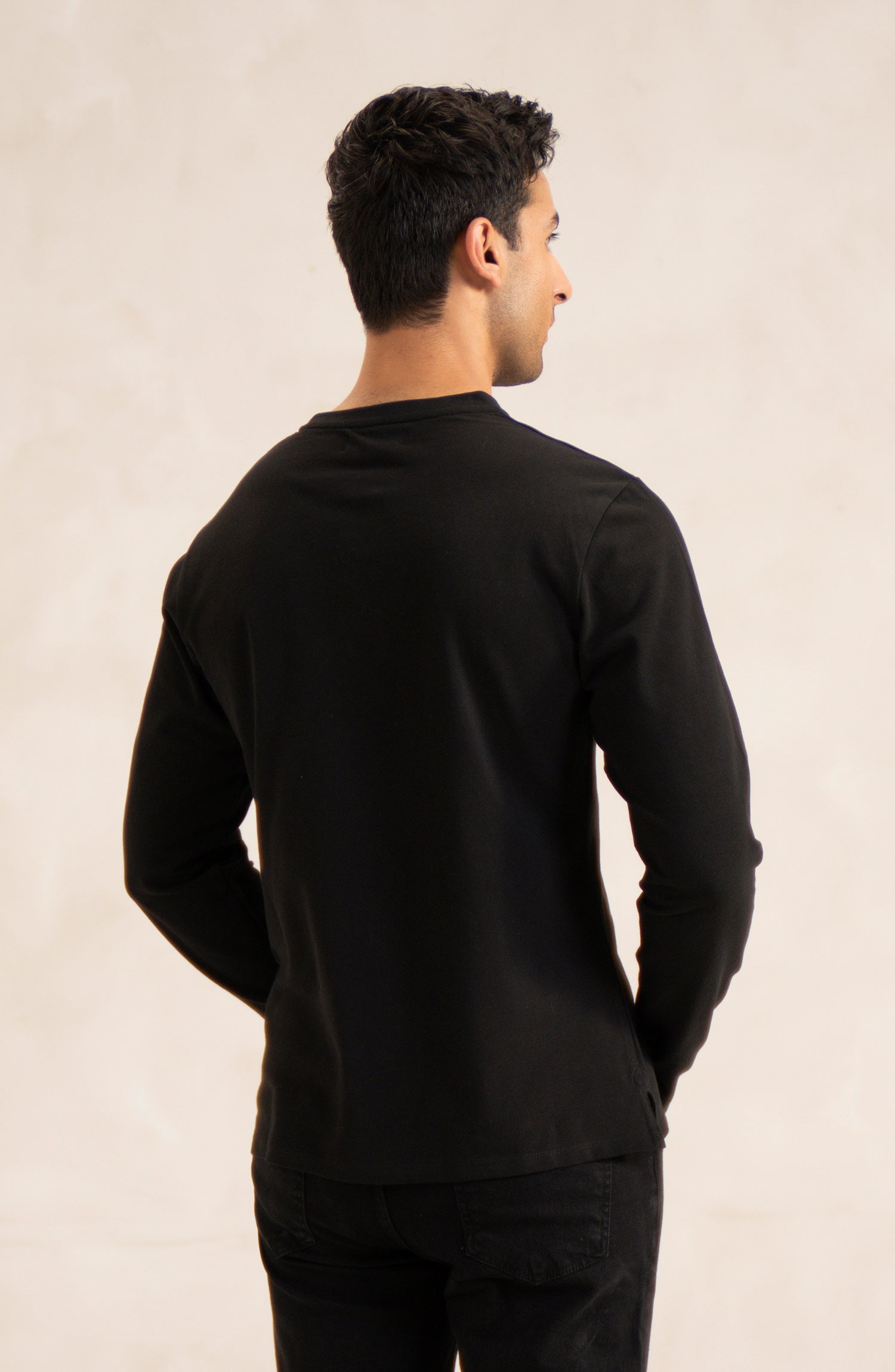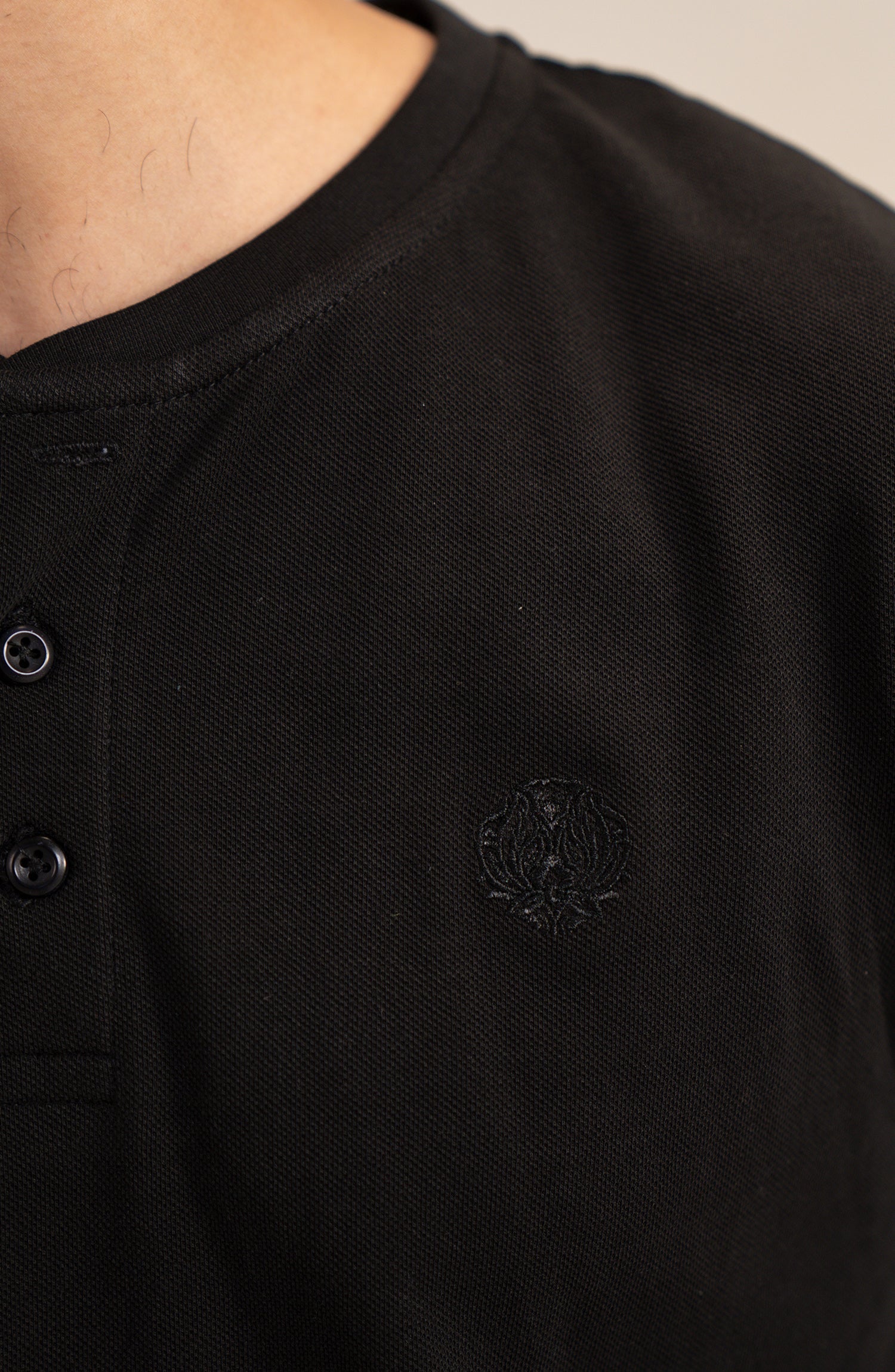 A sleek black Henley designed with breathable pique fabric for everyday comfort.