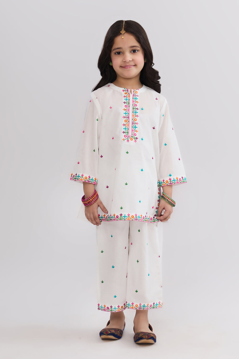 The Malala 2 piece suit in white color is a charming outfit for little girls. Made from soft cotton lawn, it offers a breathable and comfortable feel with a stylish and elegant look. Designed with beautiful detailing, it is perfect for casual wear and family gatherings.