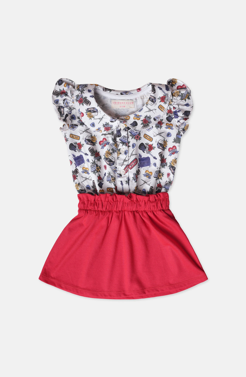 Musical Rose Print Colorful Dress With Frill &Amp; Scallop Detail On Neck &Amp; Sleeves In Soft Jersey