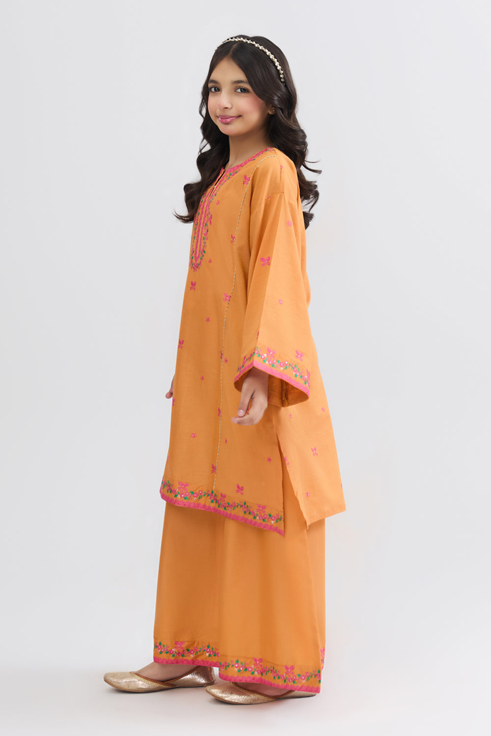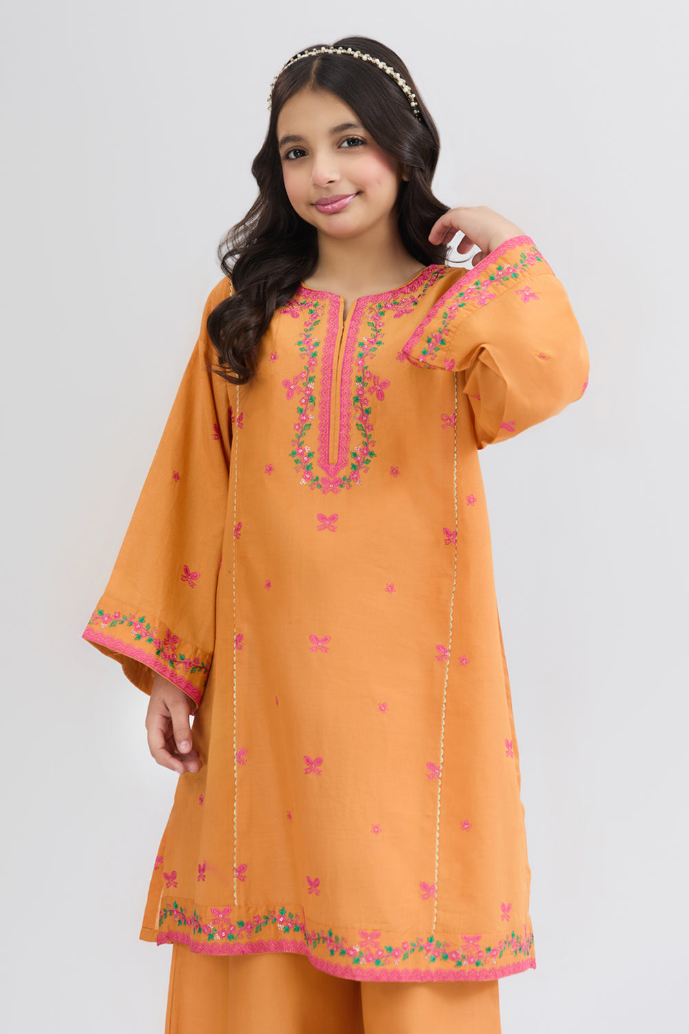 The Mango Mint 2 piece suit in orange is a vibrant outfit for girls. Made from soft lawn fabric, it offers a breathable and comfortable feel with a stylish and elegant look. Designed with beautiful detailing, it is perfect for casual wear and family gatherings.