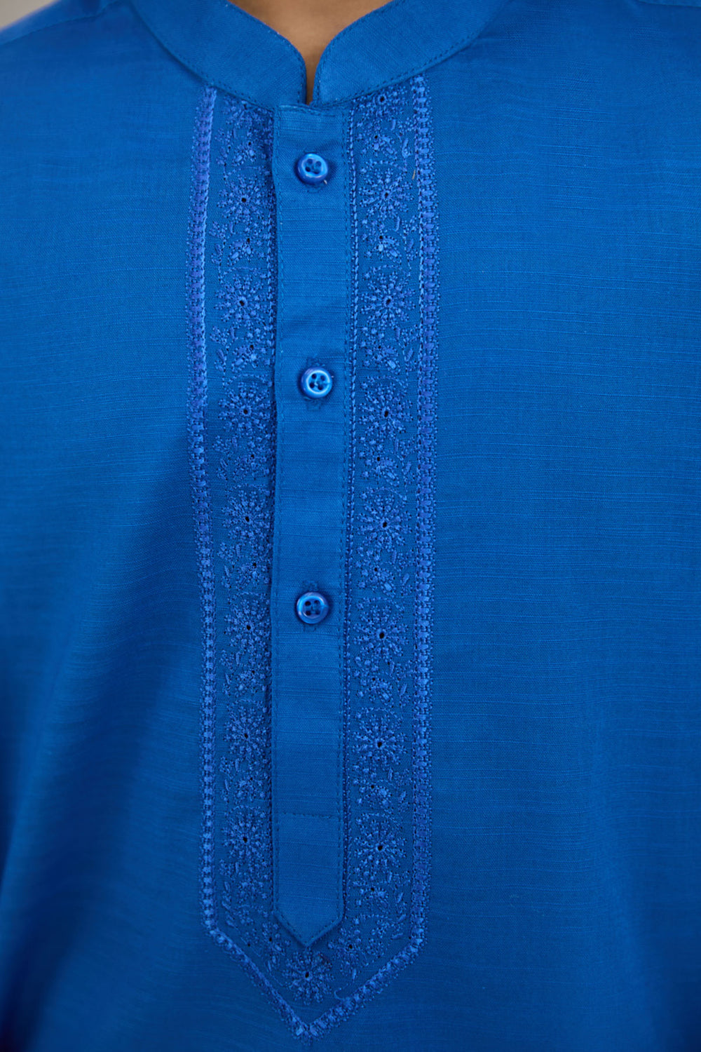 The Boys band embroidered kurta in blue is a comfortable and stylish casual outfit designed for everyday wear and leisure occasions. Crafted from quality slub khaddar fabric, it offers breathability and durability, making it perfect for family gatherings and casual outings.