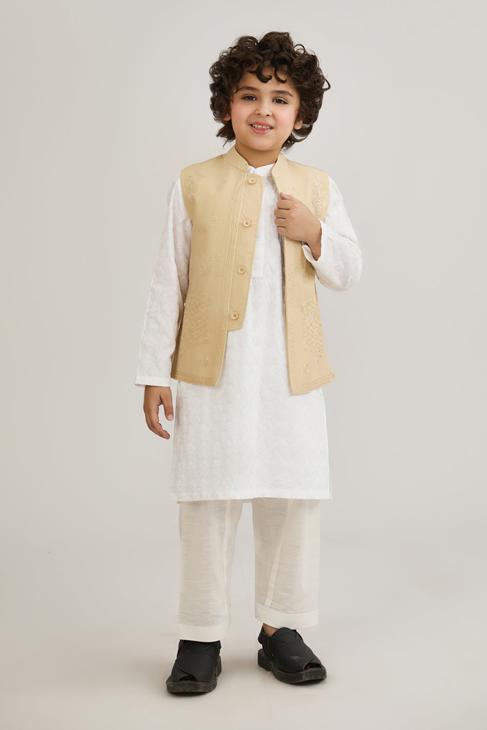 The Boys Embroidered waistcoat in brown is a smart outfit for boys. Made from soft slub khaddar, it offers a comfortable and cozy feel with a neat and stylish look. Designed with fine embroidery, it is perfect for casual wear and family gatherings.