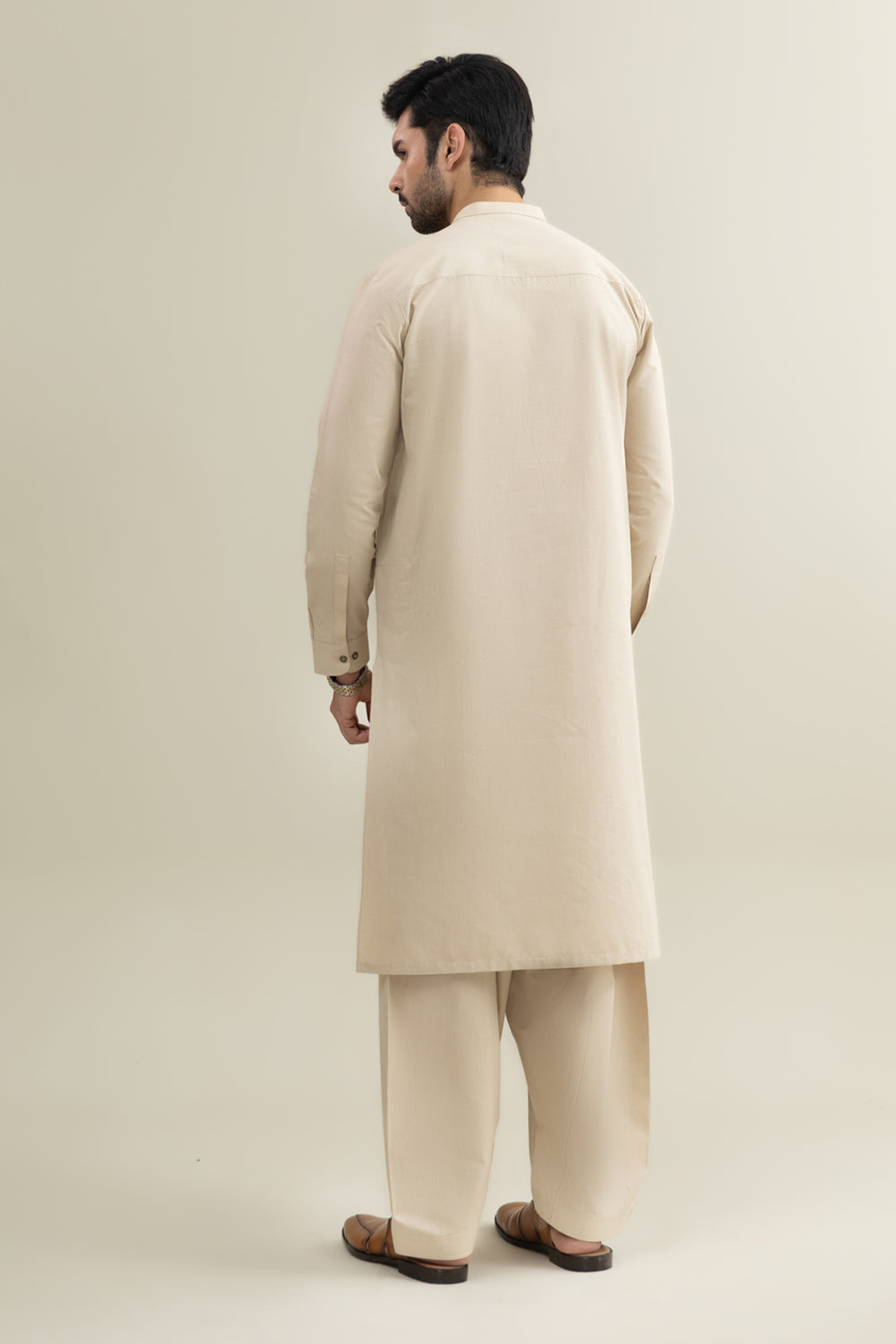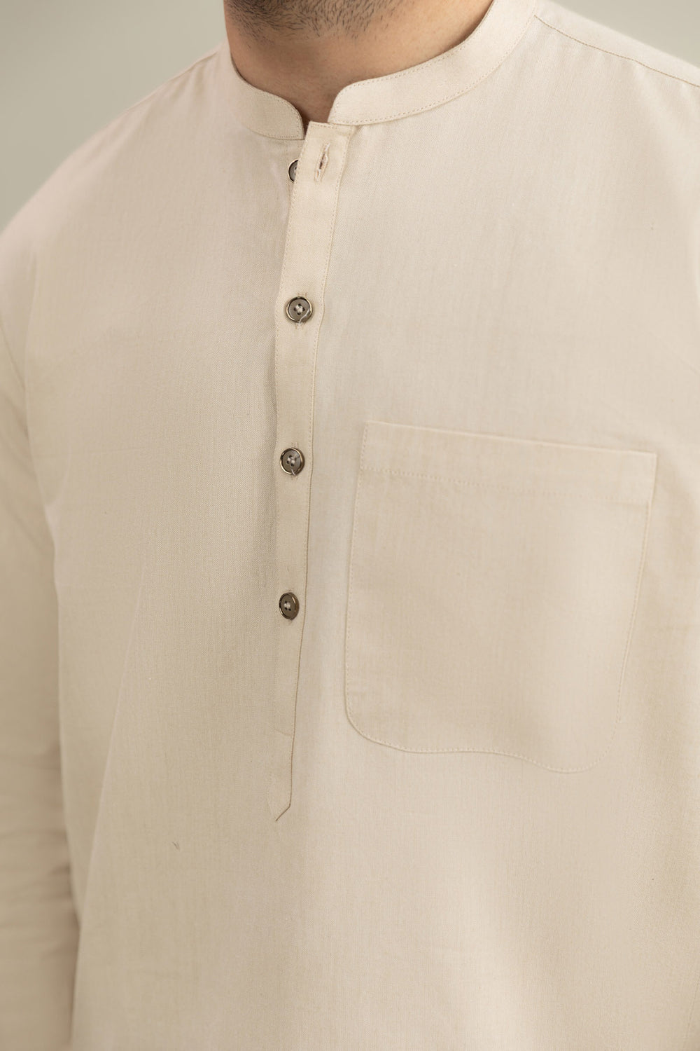 A refined Beige band-collar suit crafted from authentic Kamalia Khadar fabric, offering traditional warmth, natural texture, and a modern minimalist look perfect for everyday winter elegance.