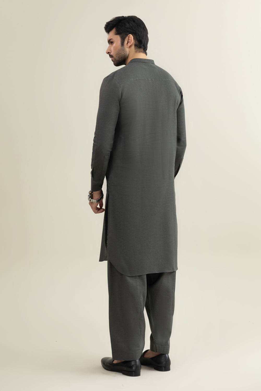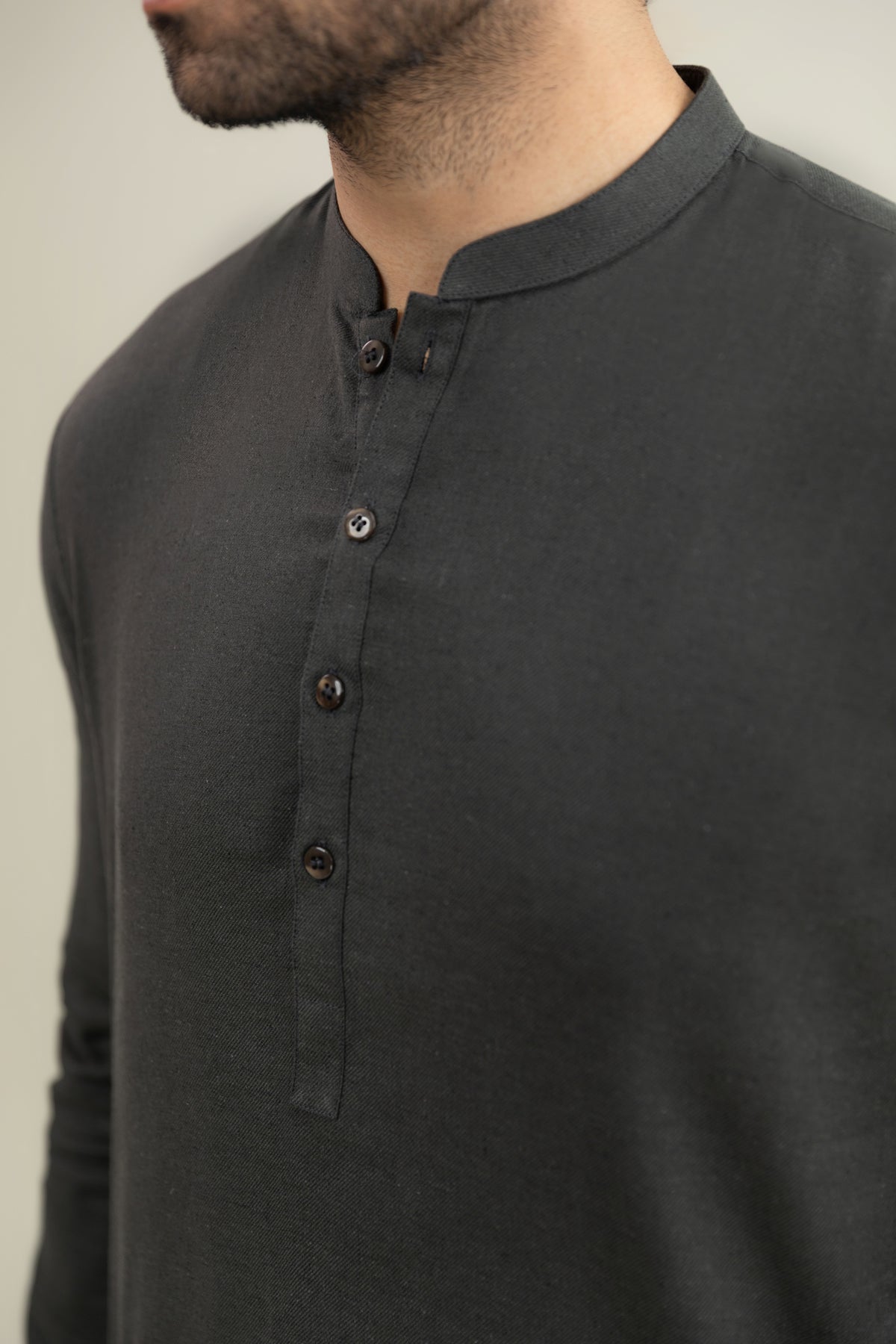 A refined Dark Grey band-collar suit crafted from a premium cotton-linen woven fabric, combining modern sophistication with breathable comfort for a polished everyday look.