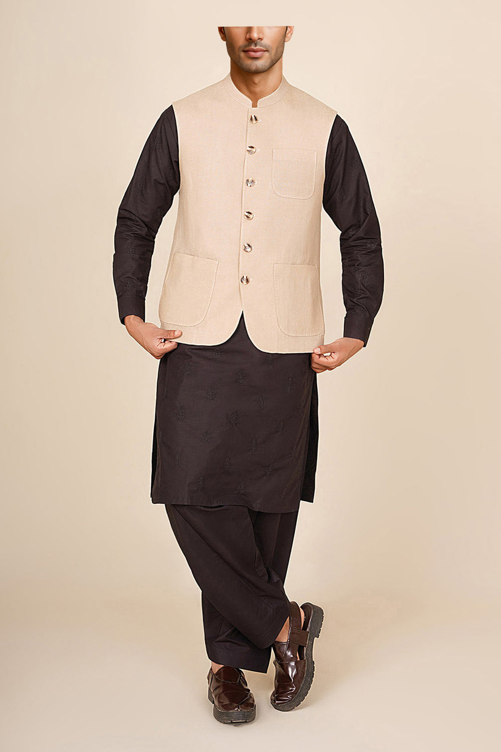 A refined band collar waistcoat in a warm wheat brown tone, tailored from a breathable cotton-linen blend for a polished and versatile addition to your wardrobe.