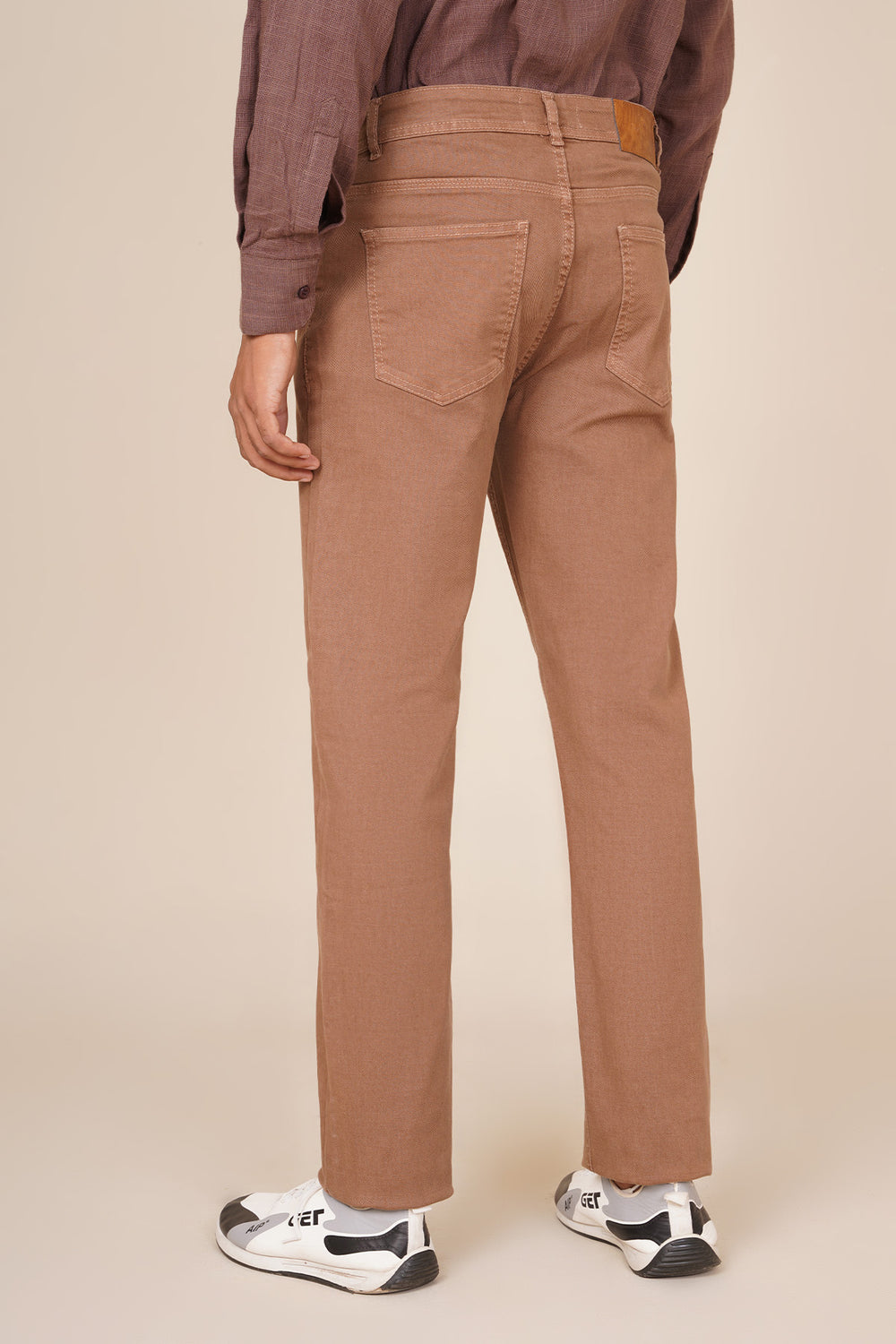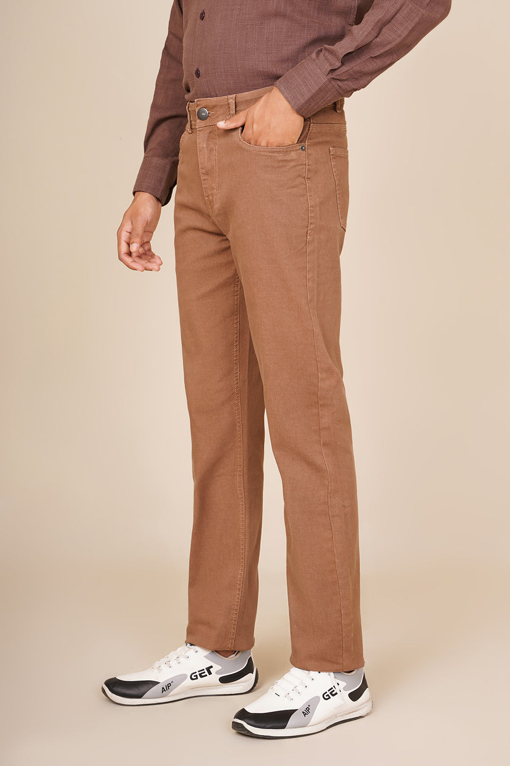 A stylish pair of brown colored denim pants made from premium stretch denim, offering the perfect blend of comfort, flexibility, and modern casual appeal.