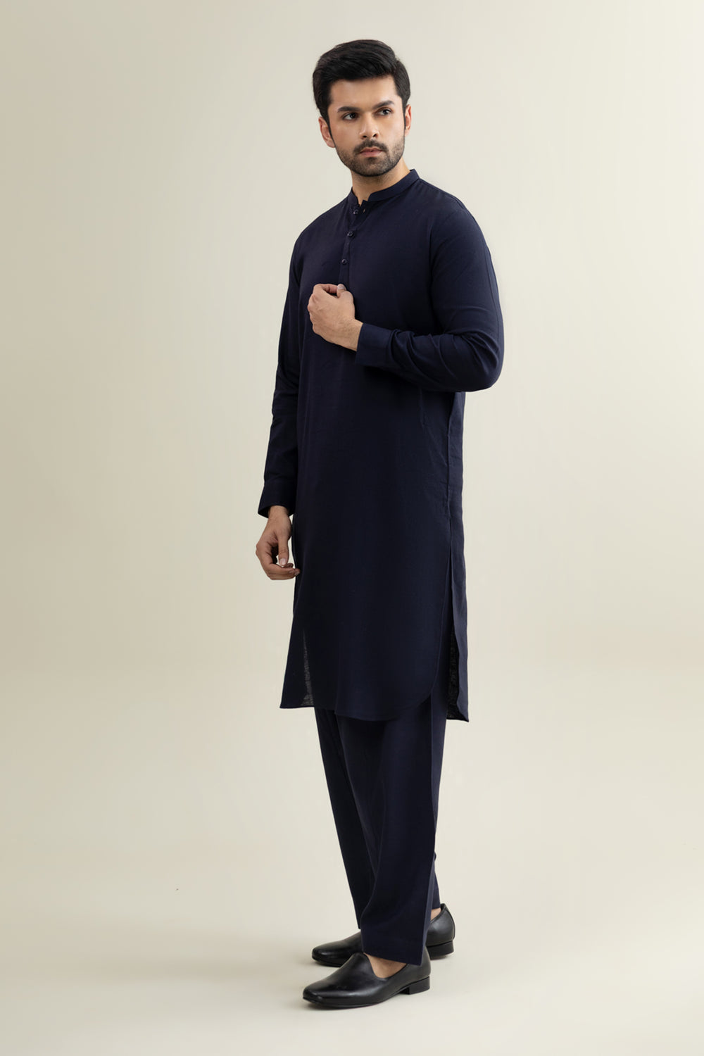 A sophisticated Navy band-collar suit crafted from a premium cotton-linen woven fabric, offering a modern, breathable, and refined look suitable for everyday elegance.