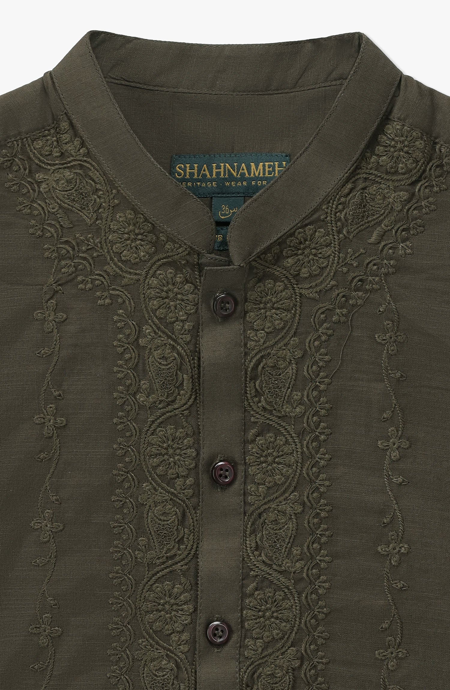 A distinguished dark olive green Lucknow embroidered suit crafted from long-staple Pima cotton, offering exceptional softness and breathable comfort. Designed with a mandarin collar kurta and matching shalwar, it delivers timeless traditional style for everyday and formal wear.