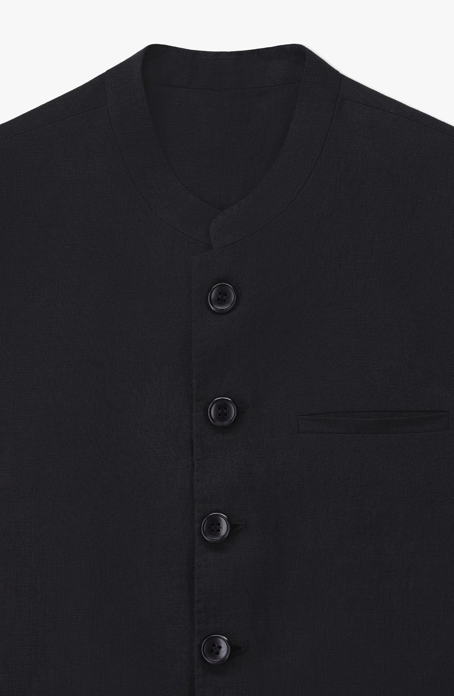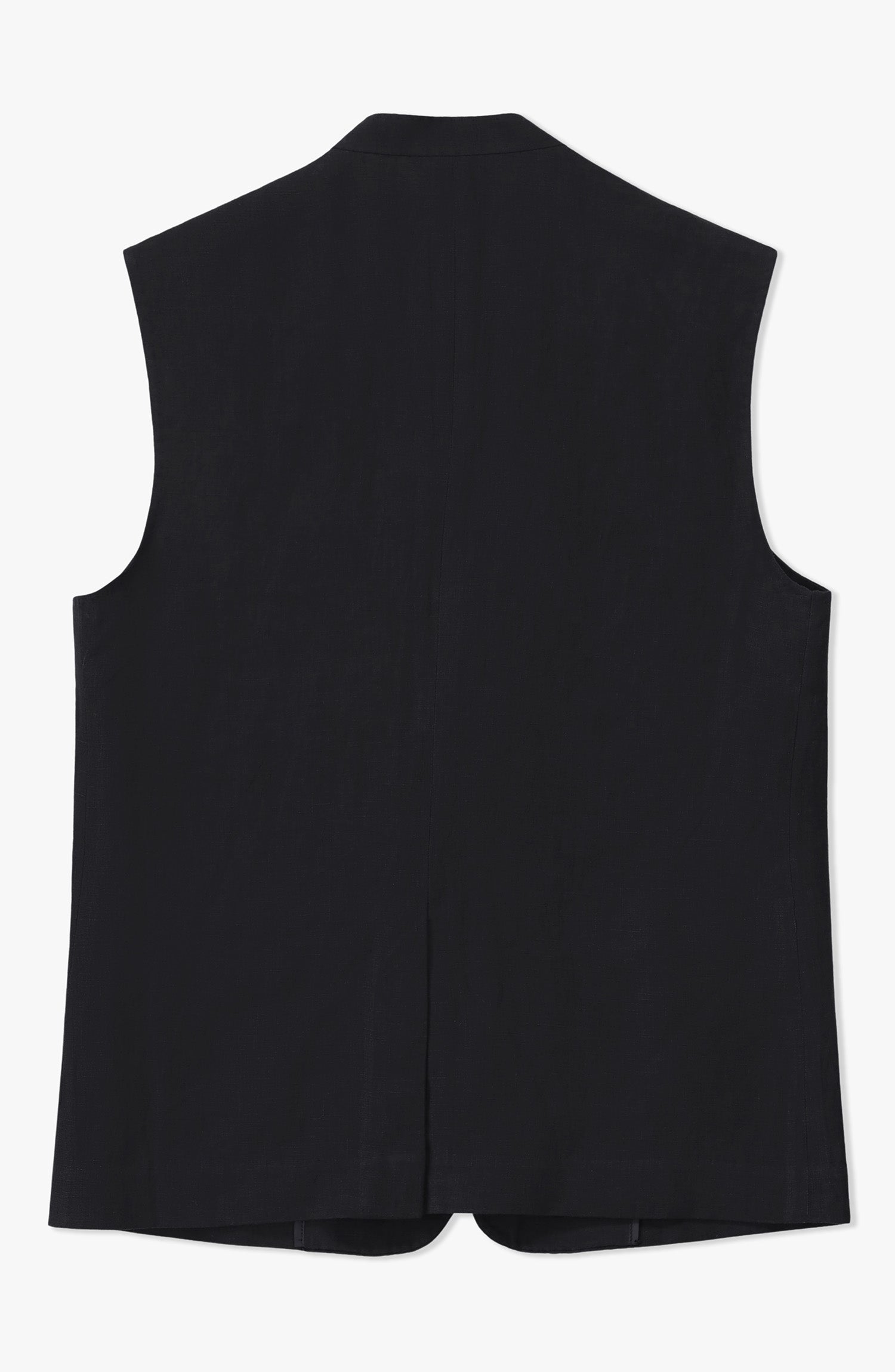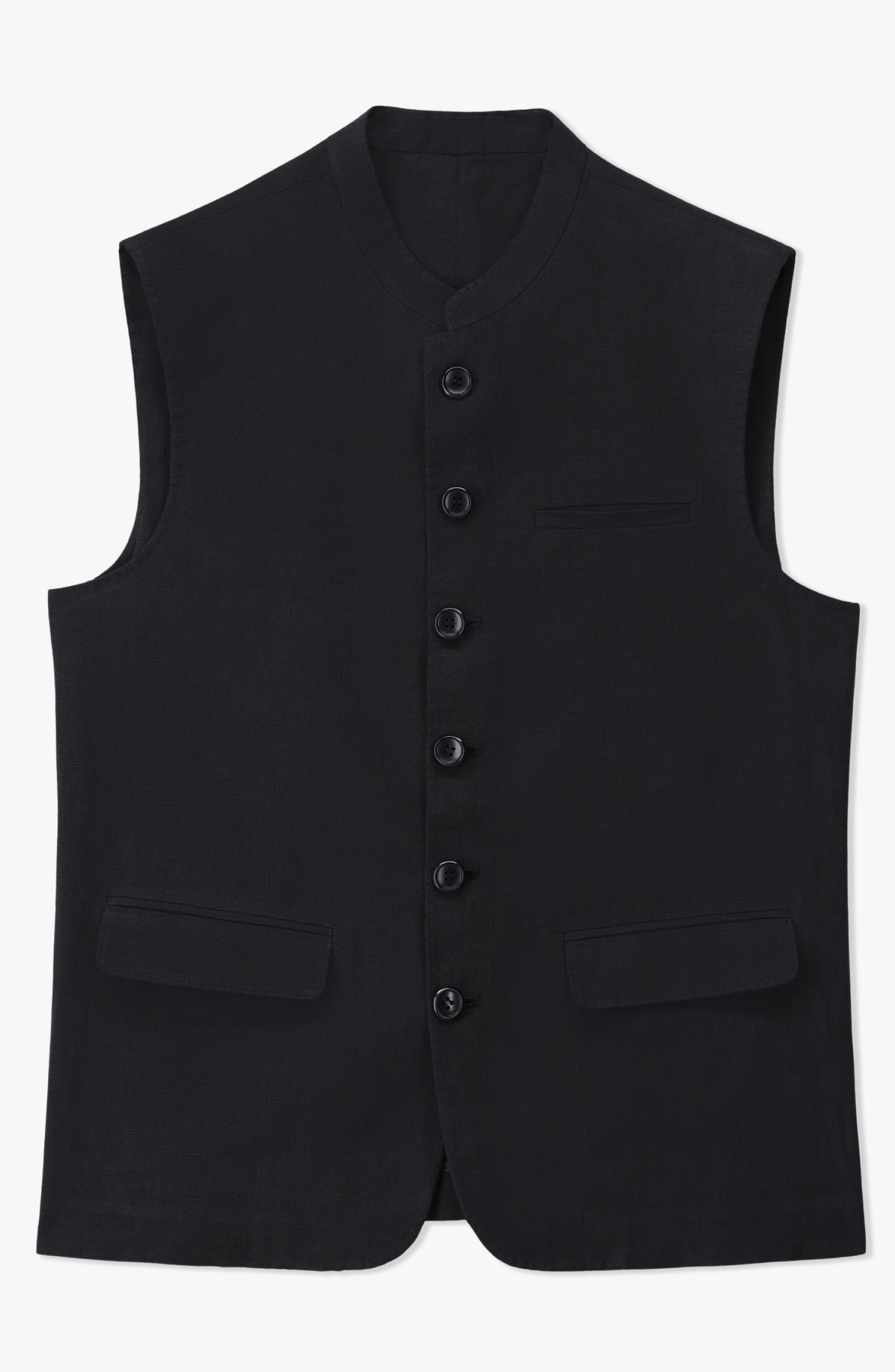 A sleek black waistcoat crafted from flax linen, offering lightweight comfort, breathability, and a refined finish. Designed with half lining, saddle stitch detailing, and flap pockets, it delivers a polished and tailored look perfect for formal or semi-formal occasions.