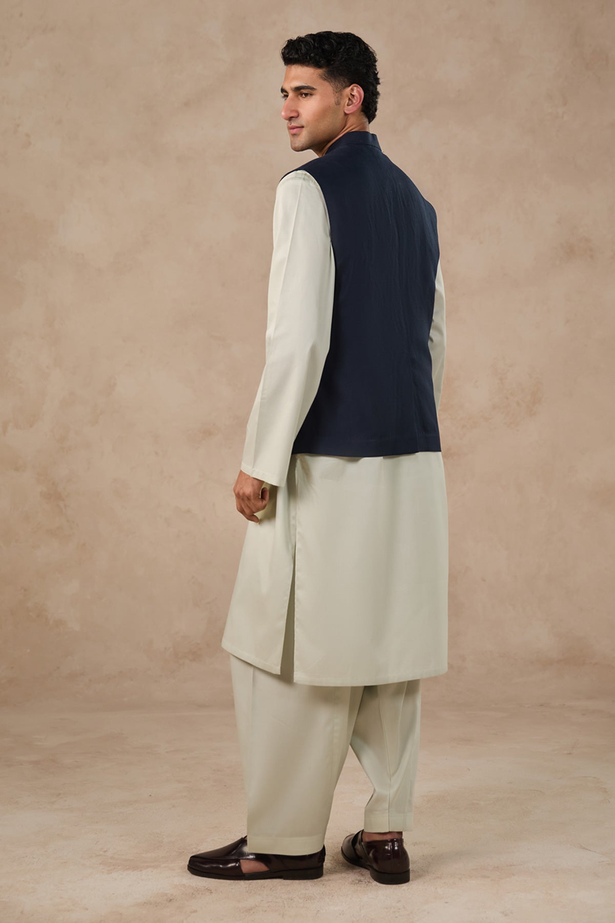 A sophisticated Navy waistcoat crafted from flax linen in a twill weave, offering a lightweight, breathable feel with a refined natural texture. Designed for effortless elegance, it provides a polished look perfect for warm-weather formal and smart-casual styling.