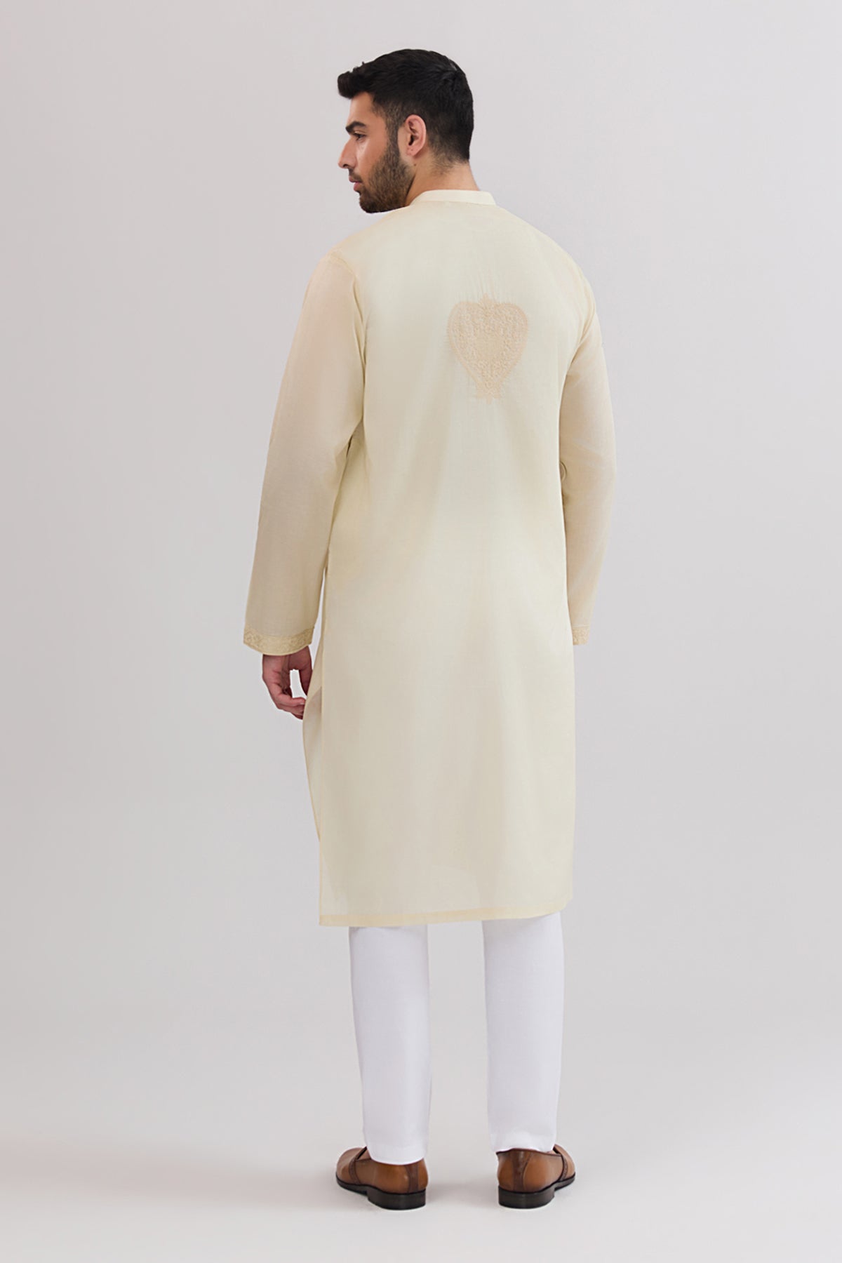 An elegant off white Chikkan Kari kurta crafted from premium Pima cotton lawn, offering exceptional softness, breathability, and lightweight comfort. Detailed with fine chikankari embroidery & a traditional cut, it reflects timeless craftsmanship perfect for festive and formal occasions.