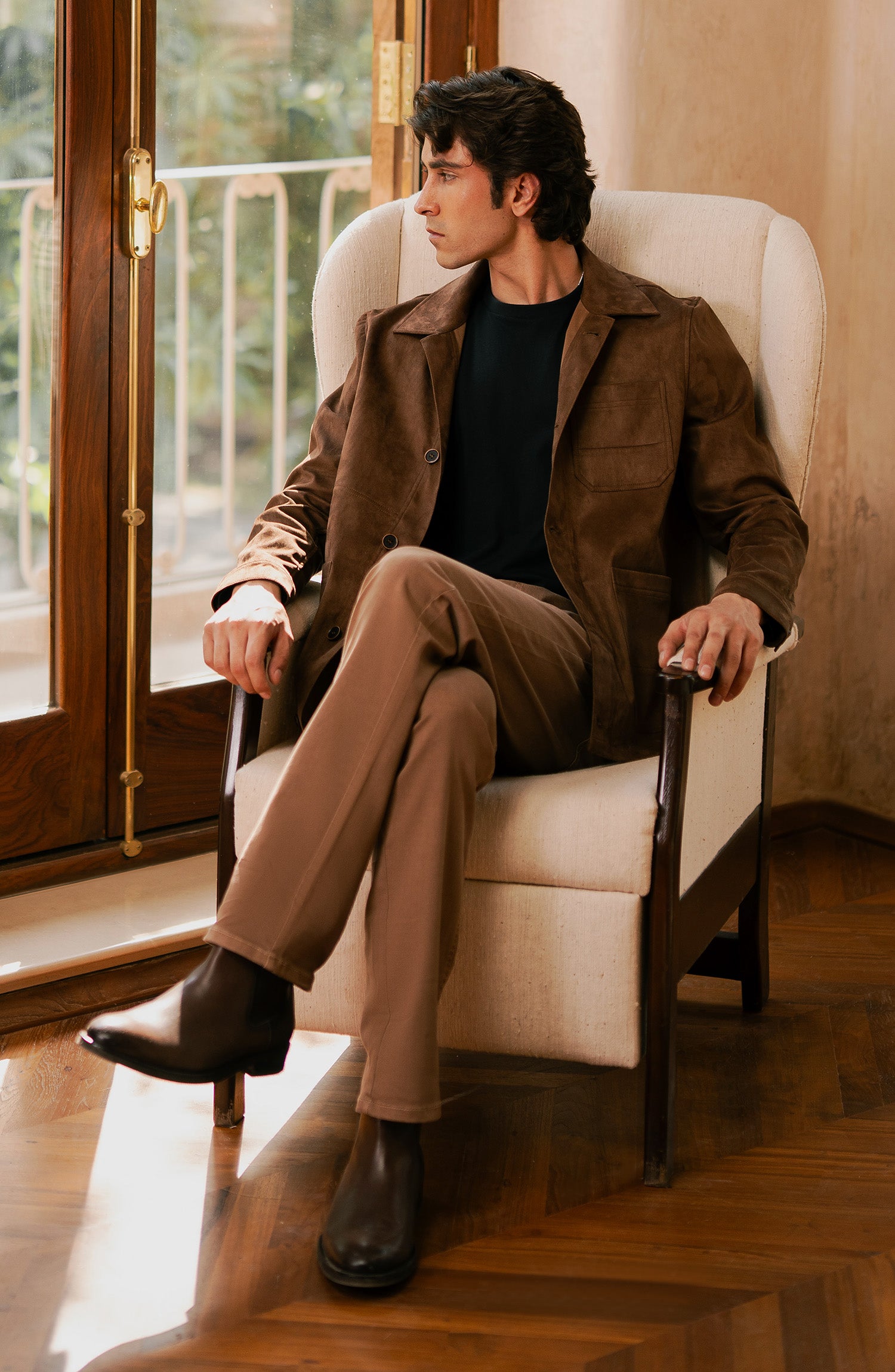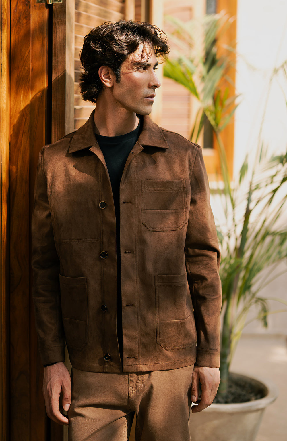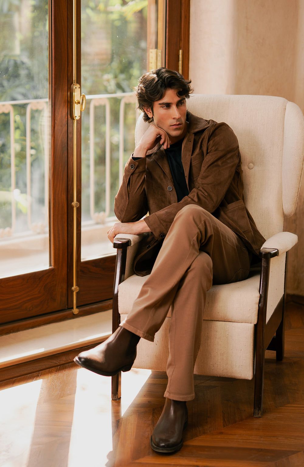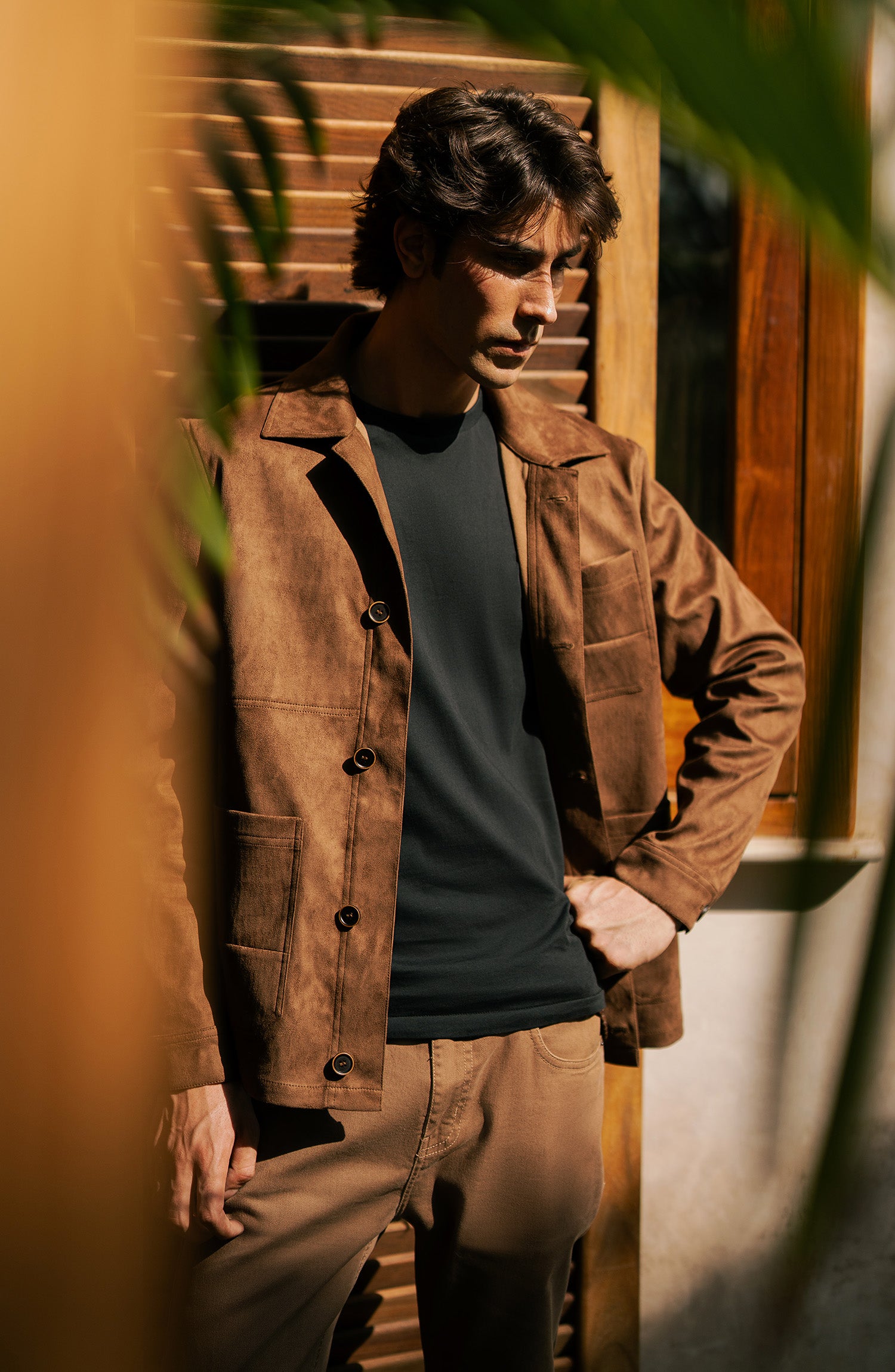 A stylish beige woven suede waistcoat designed to blend sophistication with versatility. Its classic cut and refined texture make it a perfect layering piece for both traditional and modern ensembles.