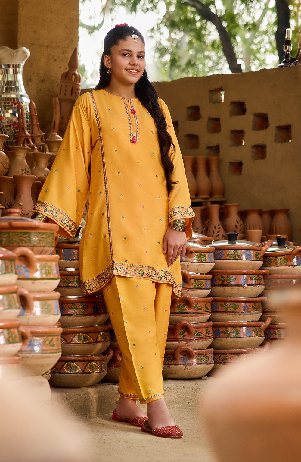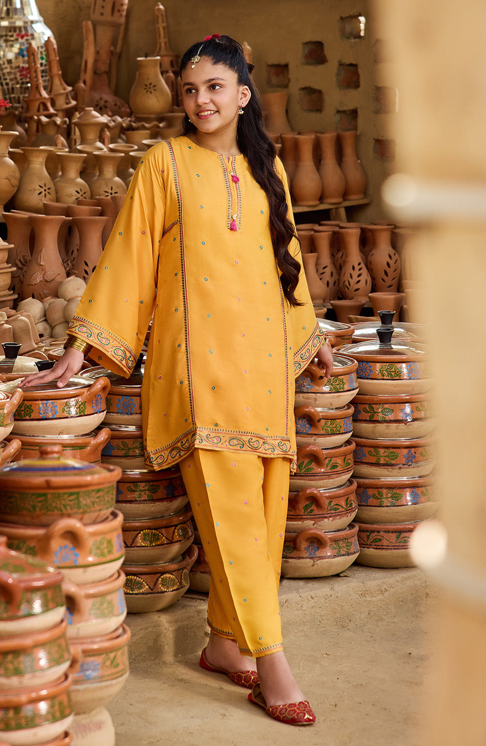 The Sunehri 2 Piece Suit in a graceful multi-color palette is crafted from luxurious Cotton Silk fabric. Designed for festive and special occasions, this elegant outfit offers a soft sheen, smooth texture, and a comfortable fit for your little one.