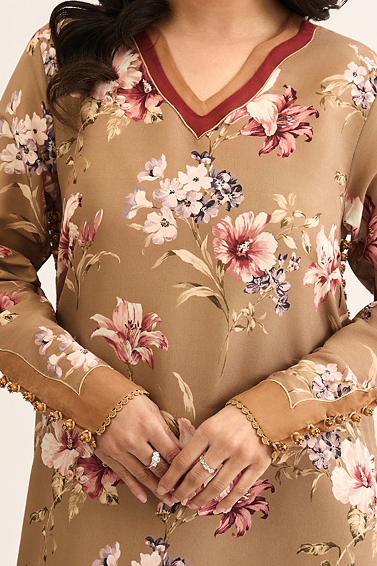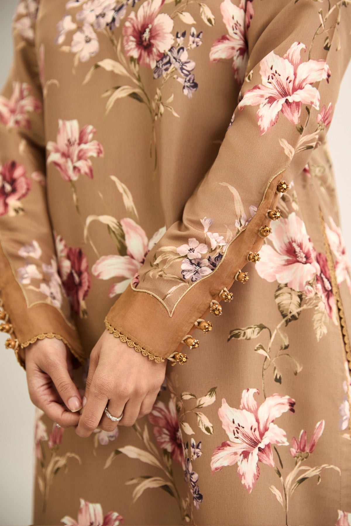 V-Neckline, Button & Loop Details at Sleeves ,Lace Details at Sleeves & Hem, Printed Long Shirt