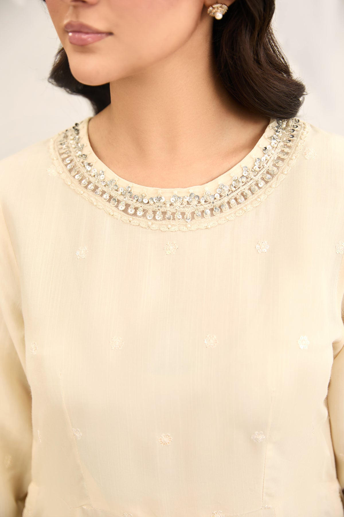 Round Embellished Neckline, Embroidered Front & Plain Back, Full Sleeves, Paneled Shirt