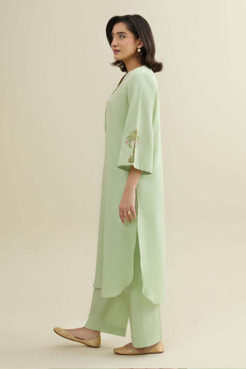 V-Band Neckline With Placket & Button Details, Embroidered Sleeves, Round Hem, Long Shirt