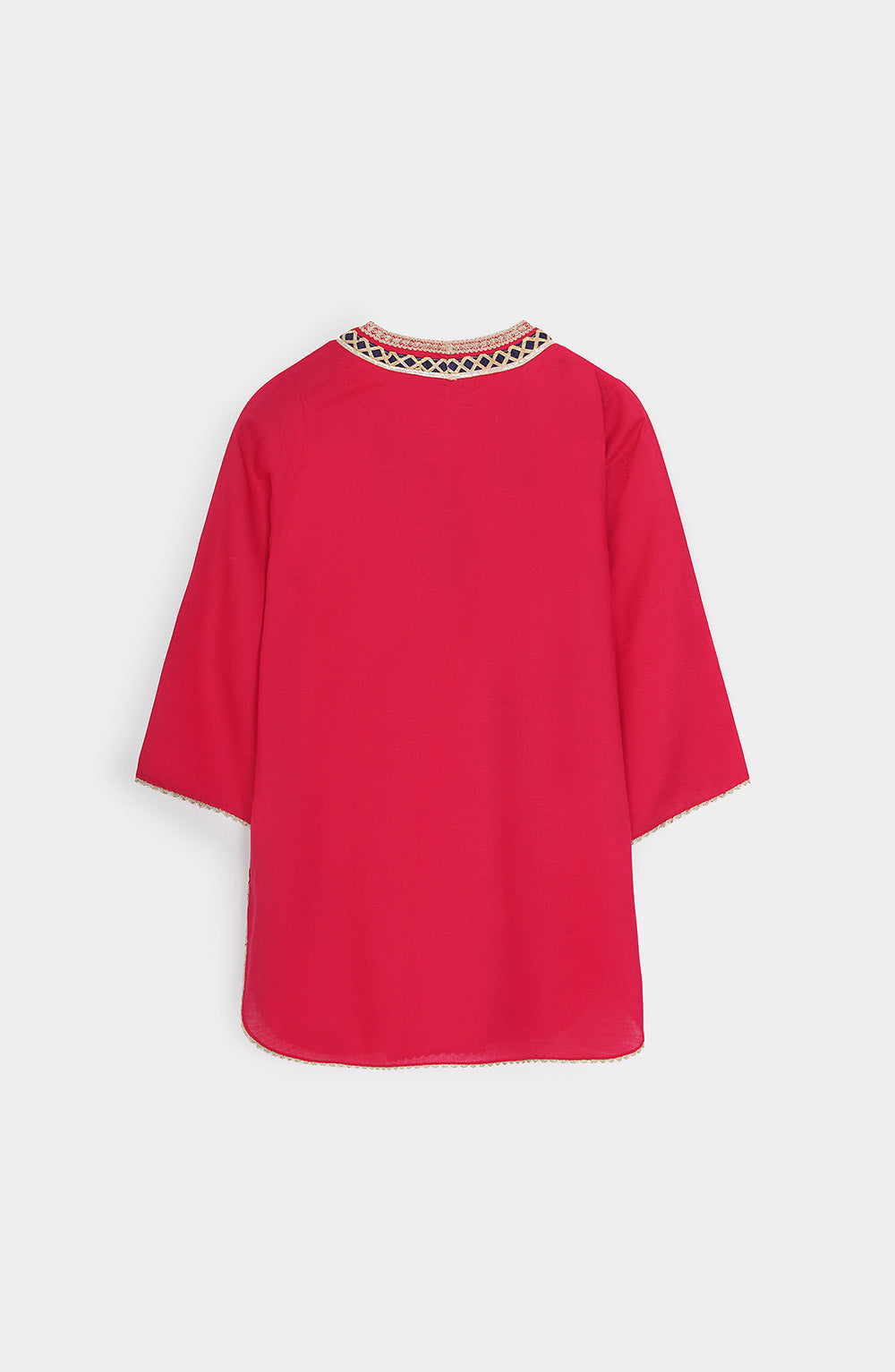 The Meher Un Nisa 2 Piece Suit in red is a charming outfit crafted from soft and breathable slub viscose fabric, this woven suit offers a smooth feel and graceful drape for little ones.