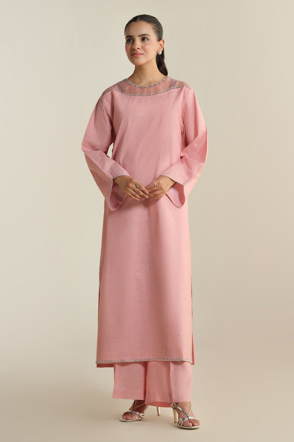 Round Embellished Neckline, Full Sleeves, Long Shirt