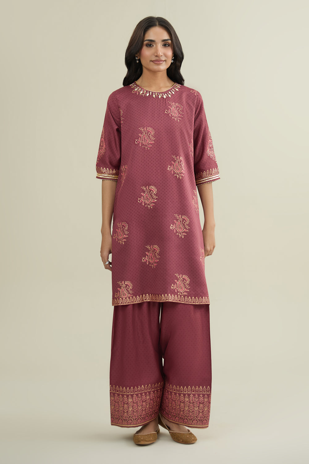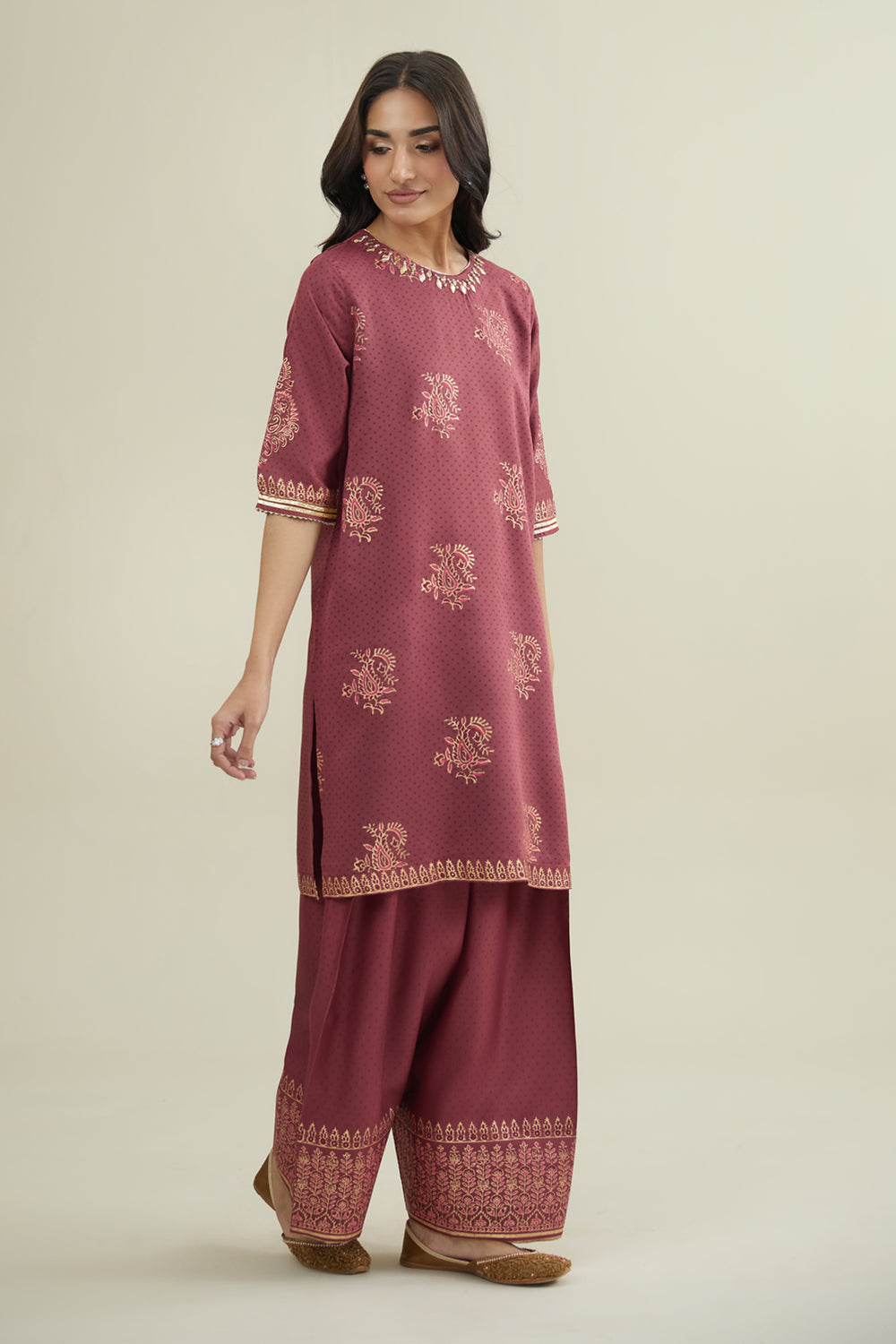 Embellished Round Neckline, Quarter Sleeves, Printed Shirt