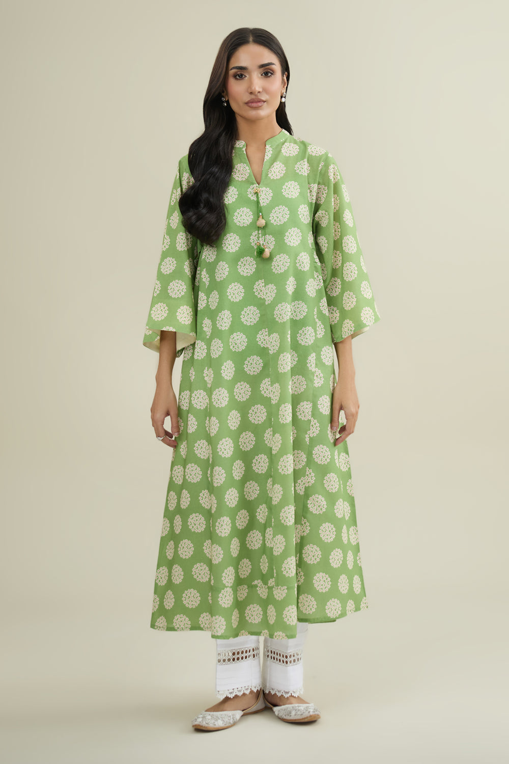 Band Neckline With V-Slit, Dori & Tassel Hanging Details at Neckline, Quarter Sleeves, Long Shirt