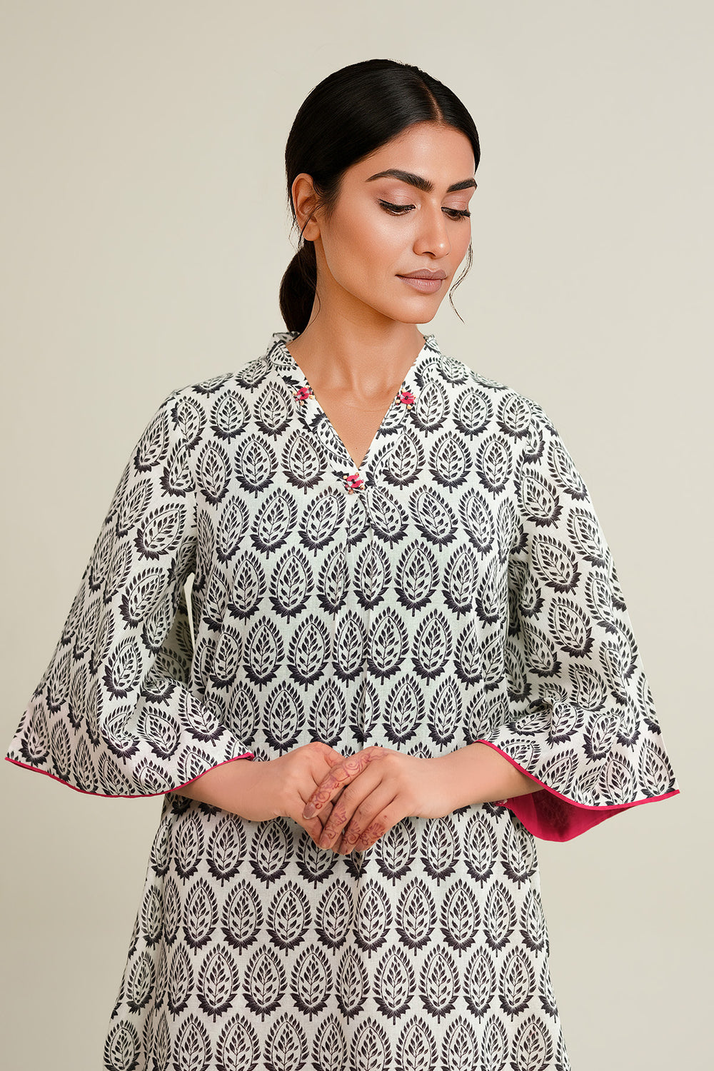 V-Neckline, With Embellishment at Front, Quarter Sleeves, Round Hem, Long Printed Shirt