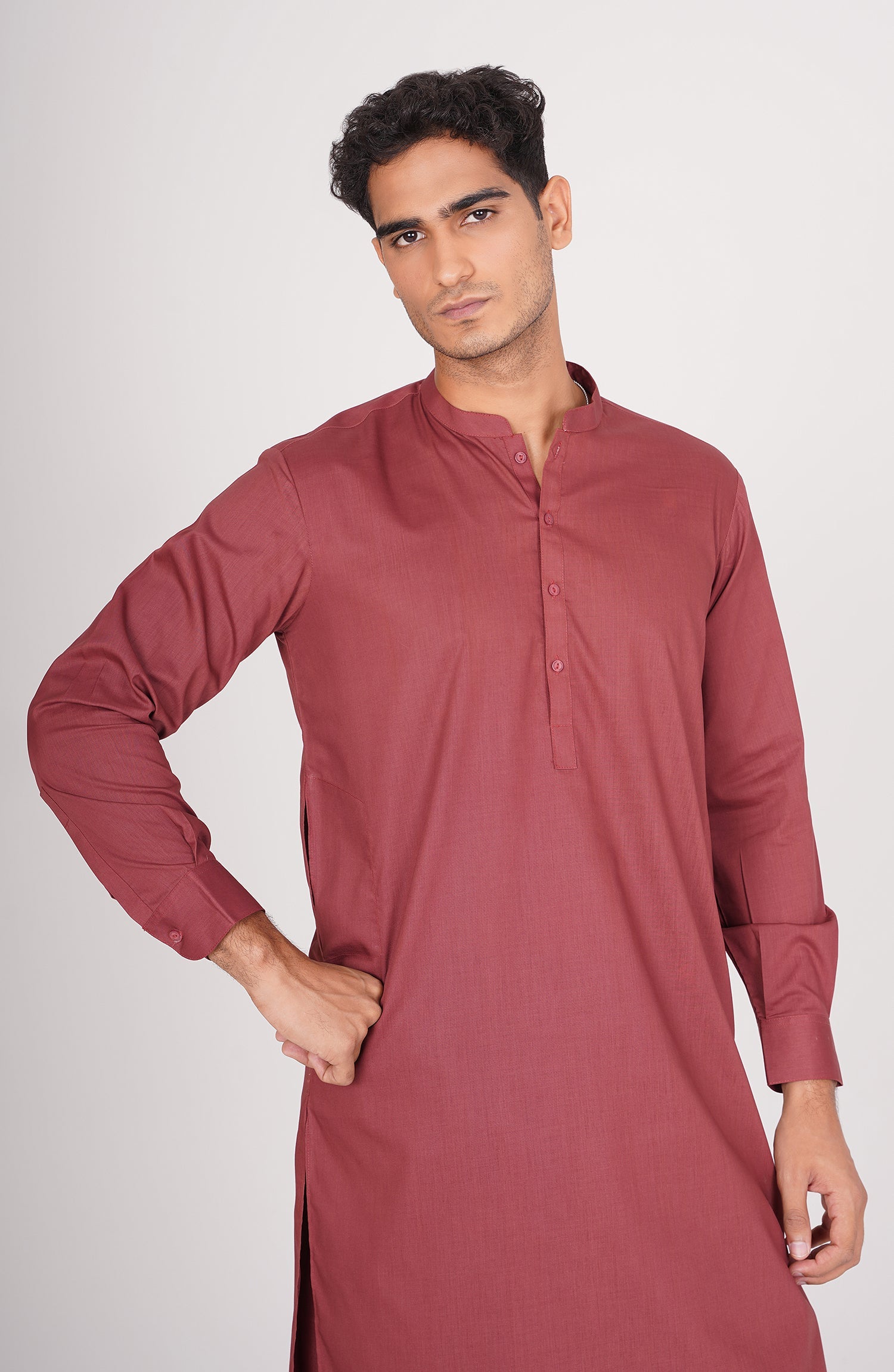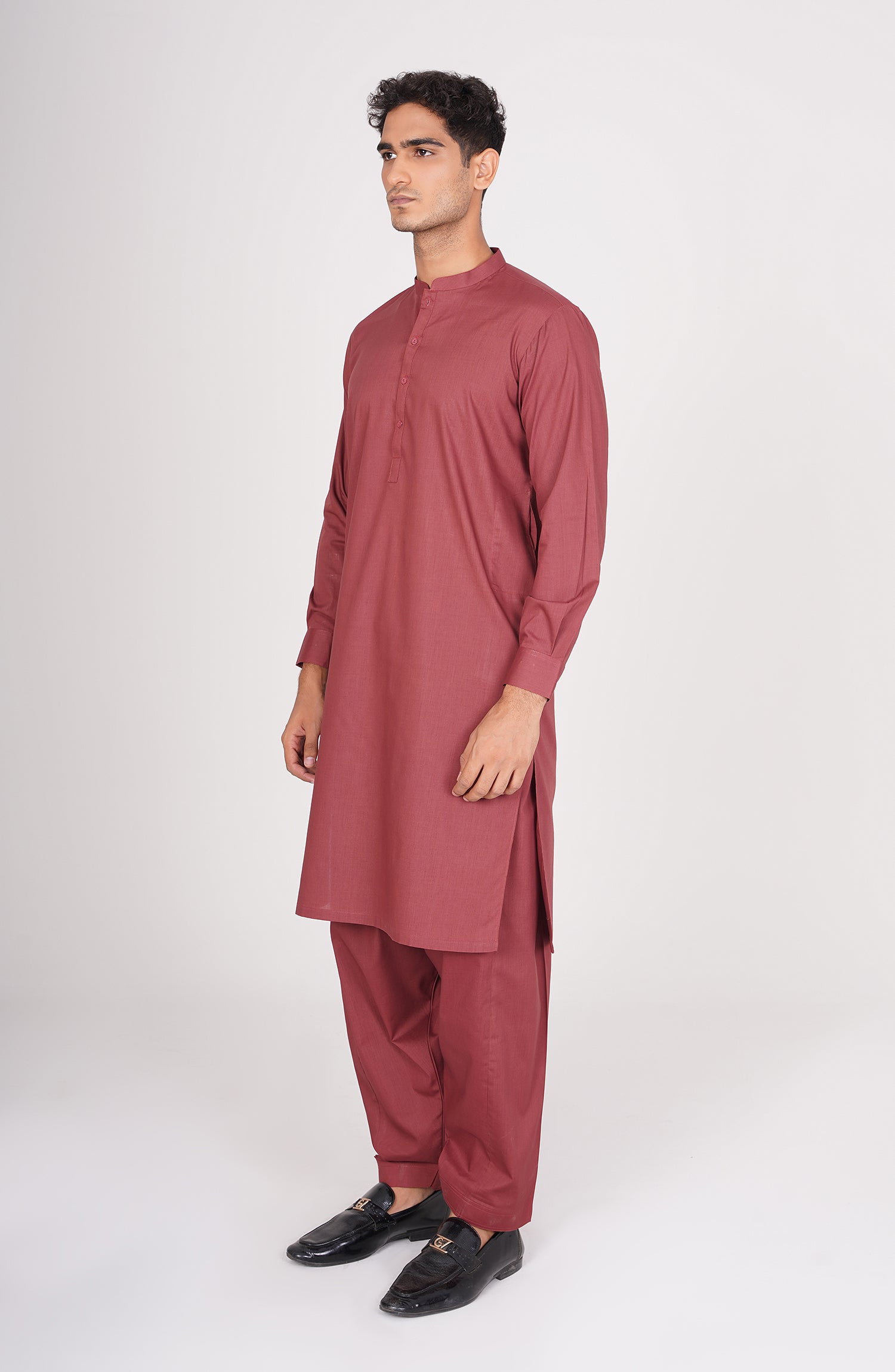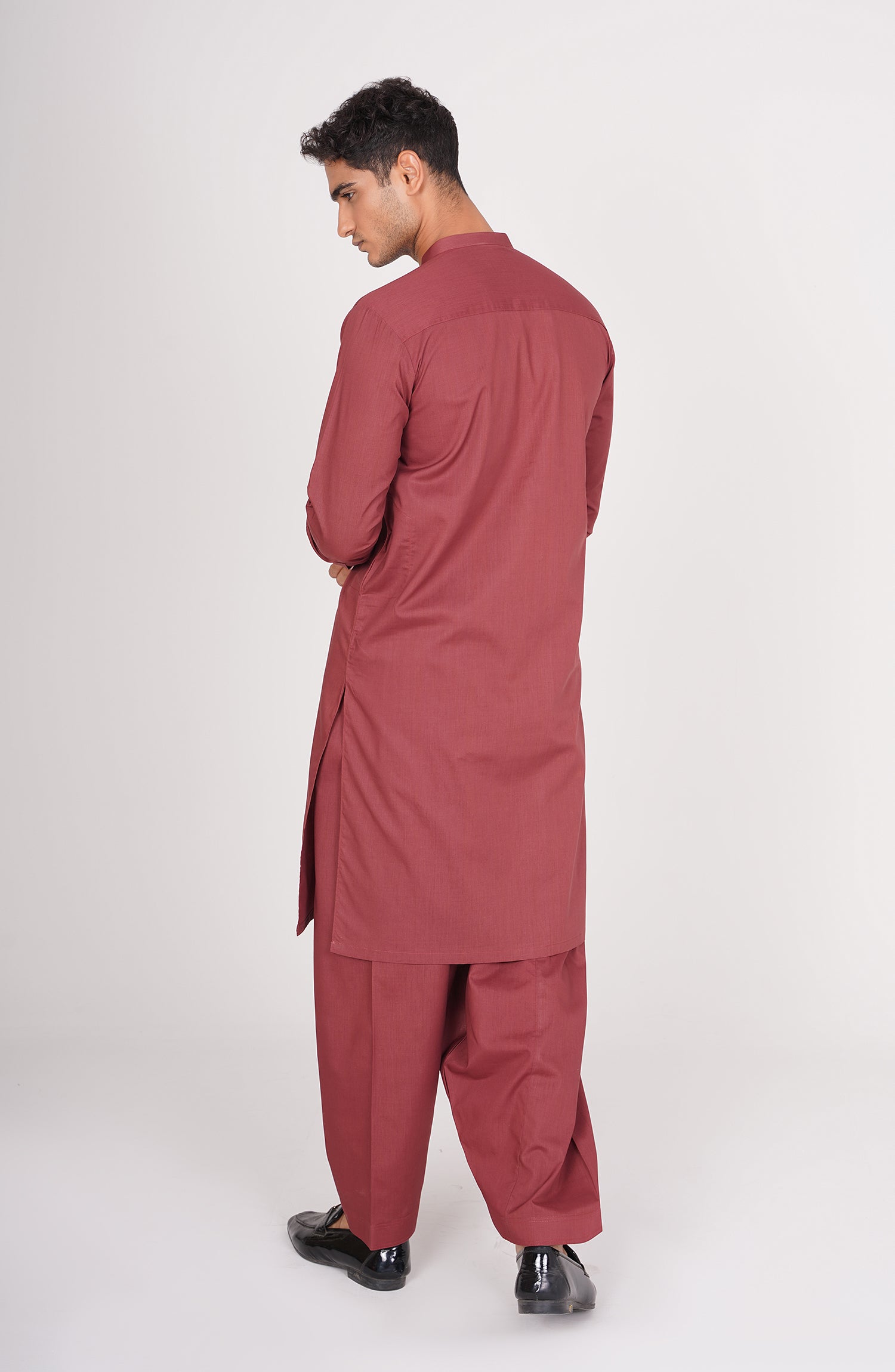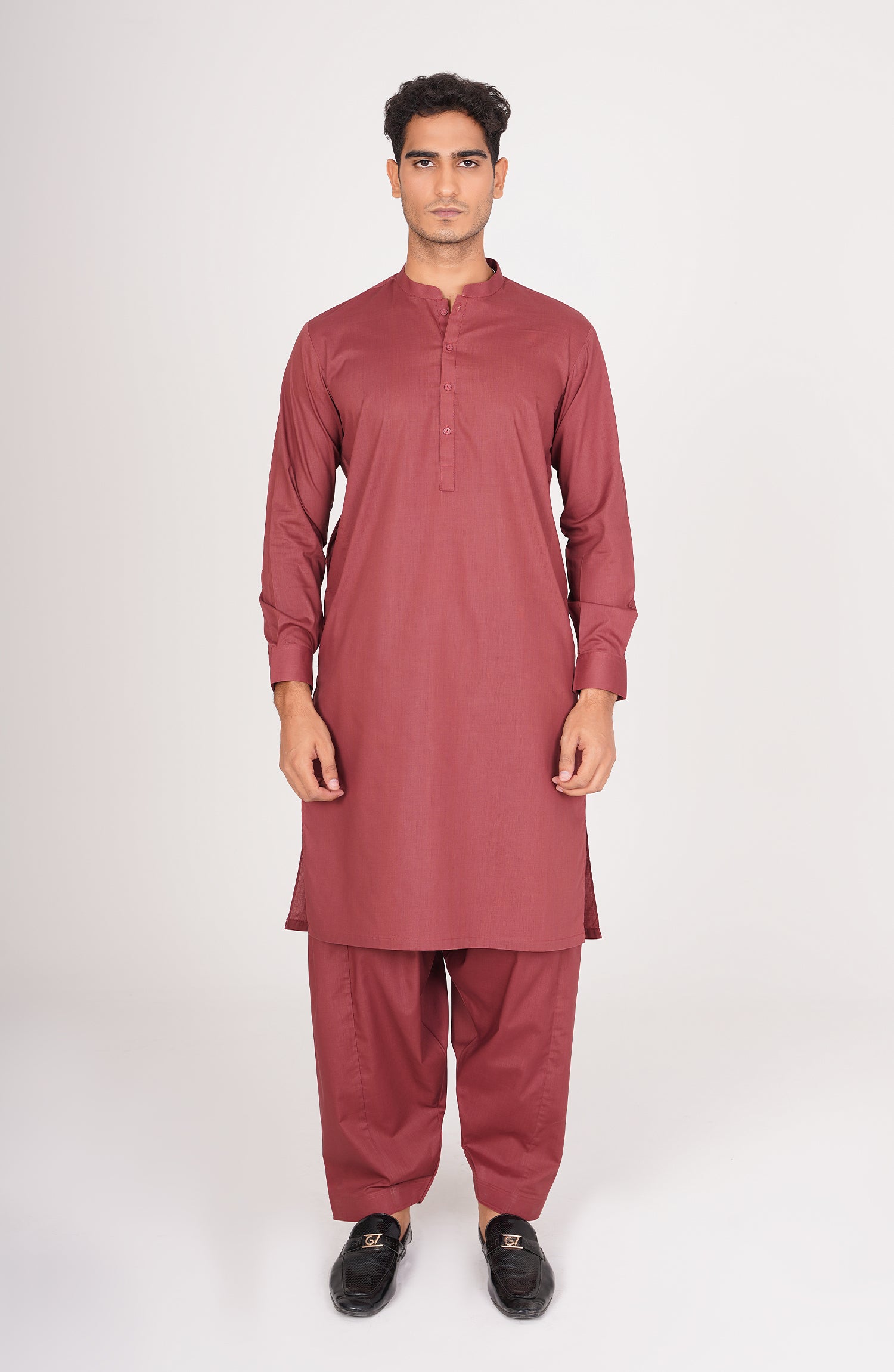 A refined maroon kurta shalwar suit combining timeless tradition with modern elegance.