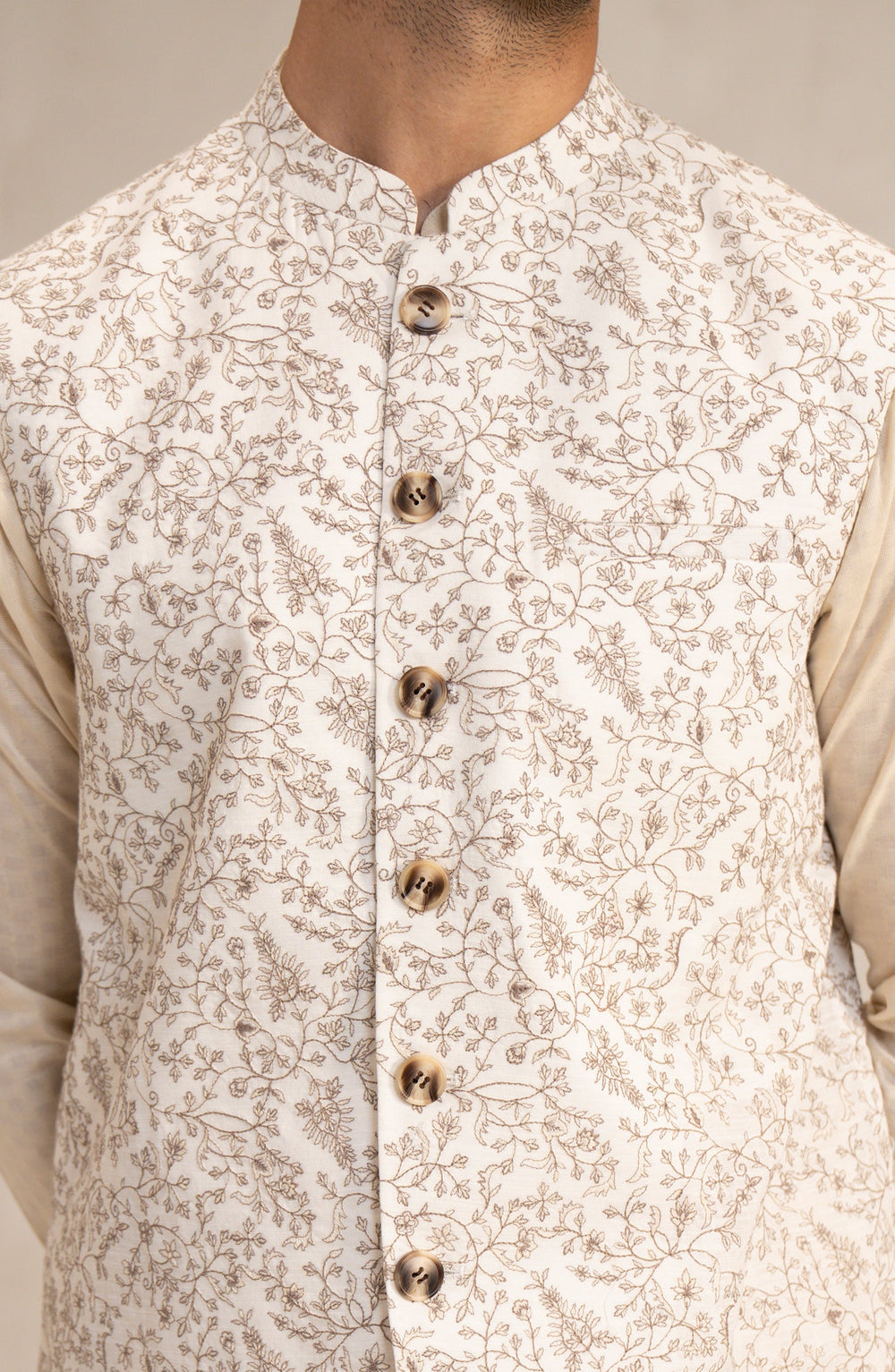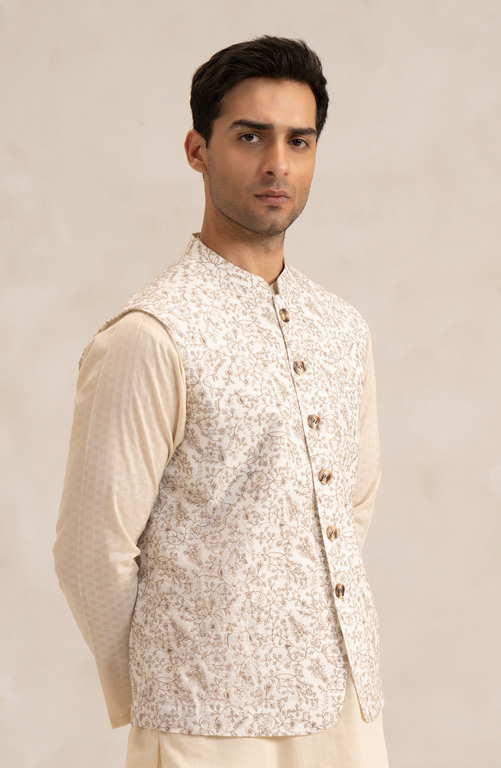 A refined embroidered waistcoat in premium slub khaddar, perfect for adding elegance to any traditional outfit.