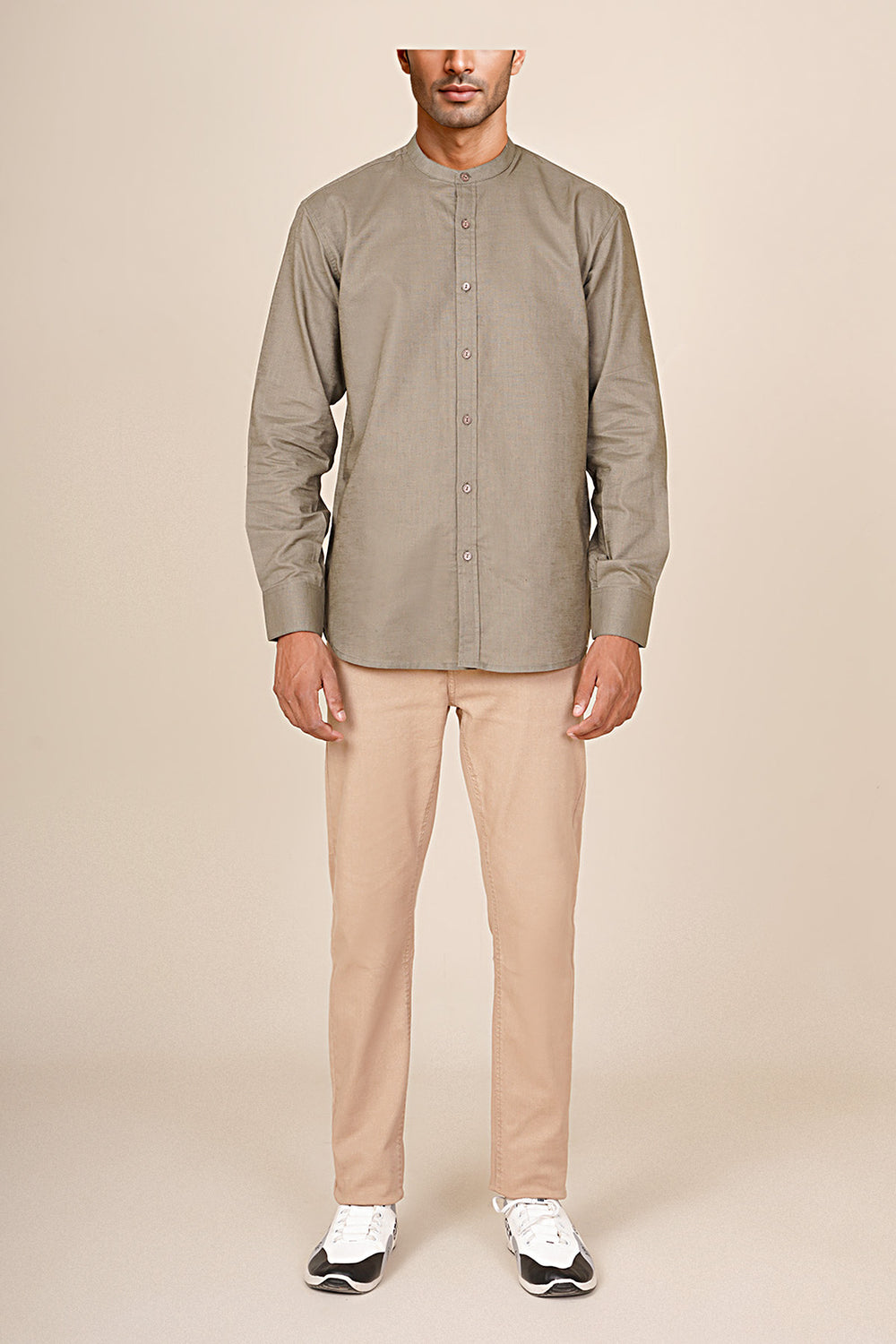 A sophisticated Green mandarin collar shirt crafted from a breathable cotton-linen blend, offering a perfect balance of comfort and refined elegance for any occasion.