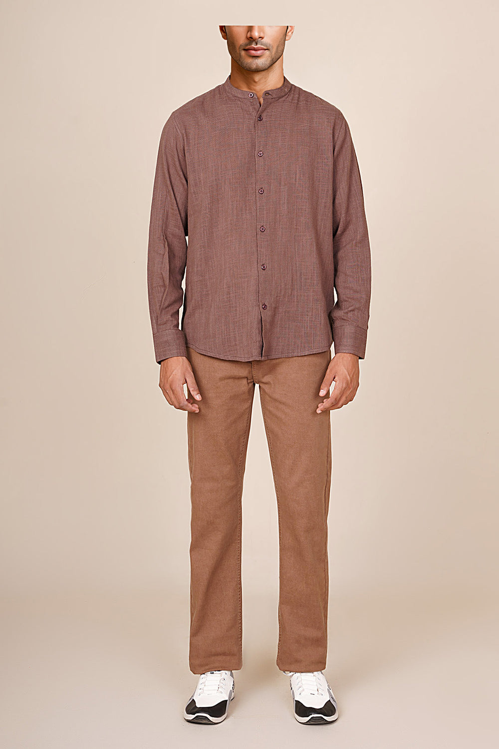 A refined brown band collar shirt made from premium cotton slub fabric, combining a relaxed texture with a modern, minimalist design for effortless everyday style.